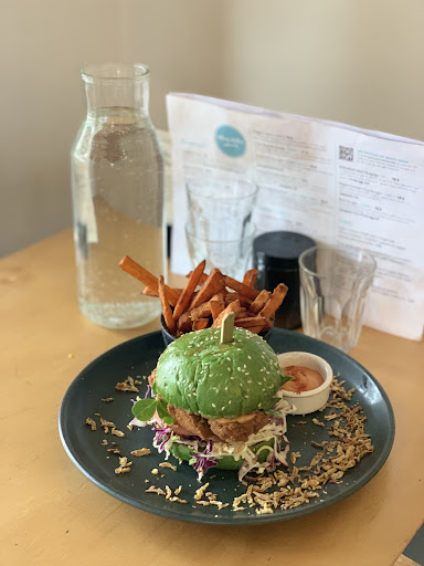 FOOD: I ordered the Vegan Chicken Pop Burger and if Iām gonna be honest, this is the first time Iāve ever eaten vegan chicken and this burger is probably the best burger Iāve ever had in my entire life, Iām not even exaggerating 𤣠I am personally a huge fan of popcorn chicken and I thought why not give a vegan burger a chance and it was the best decision Iāve ever made. I would take this vegan burger over every other burger Iāve ever had. The vegan chicken actually tasted like vegan chicken, the spicy mayo was phenomenal and was actually spicy, the batter of the vegan popcorn chicken was PERFECTION and the sweet potato fries is one of the best sweet potato fries Iāve ever had and with that spicy mayo?? Heaven! 𤤠The matcha burger was a very subtle but pleasant addition and tbh it looks GORGEOUS. Both food and presentation wins the biggest A+ for a burger Iāve ever given!