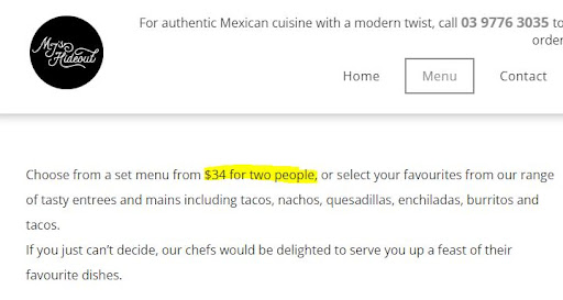 Our first visit to MJ's and having looked at the menu online, I was looking forward to it. The website says the set menu was $34 FOR two people...which would be reasonable because all the portions were TINY. (eg: taco is width of my palm). We ordered that, a (small) salad bowl ($16), a soft drink and tea. (note: there is another set menu for $55...) Service was average. (Had to ask for plates, and I came downstairs to place my order). The restaurant had NO MILK (no hot chocolates for the kids) - and NO GREEN TEA available. Was shocked when the bill was $94.50. Questioned it, and she said "$34 PER person". When I showed the website - she didn't care. I've never felt the urge to write a negative review until now. It's a tiny restaurant, with tiny portions of food... but a large bill at the end of it. We eat out every week, and I don't mind paying for good food, good service and good atmosphere. Unfortunately, MJs was none of this.