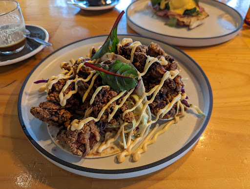 Our food though was a little bit disappointing, I had the soft tortillas with fried chicken and slaw. The chicken was overcooked, dry and under seasoned. And my partner had the eggs Benedict and the spinach was a little soggy and the hollandaise sauce wasn't the greatest.