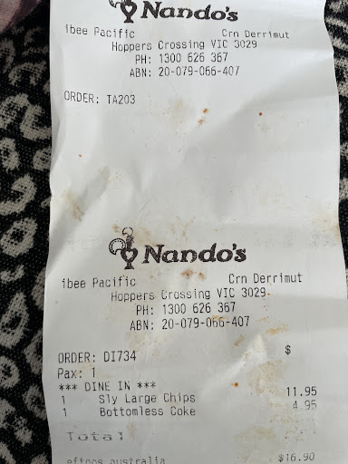 I have just had the worst customer service experience i had in a restaurant from this Werribee store. If my friend hadn't already had ordered I would of gone to Schnitz instead for a reliably great dinner experience. It started with no glasses given. The reason we were told was "they're all in use". In a covid pandemic this is disgusting to expect a customer to share out of a single glass bottle with no glasses. Then the queue to order took over 25 minutes to be served. I asked if their second register that wasn't being used - was broken, the manager said that it was working, but they only have 1 staff in the restaurant that can use it. To hold up 10 customers after myself who was second in line, is wasting everyone's time and obviously demonstrating severe unstaffed and lack of training in your business, resulting in an inability to cope with basic customer service. I have raised these concerns with the management and was disregarded to continue cleaning tables and walking laps around the store. The checkout lady was nice though. Nandos is meant to pride itself on it's quick and sufficient service which it has completely failed on. The $9 burger was tiny, appropriate for a child and not an adult, no serviettes were served with my dish, and the management of this establishment has made myself or my friends to never return. I will be spreading this experience to my friends and family because no one else should have a dinner ruined, their time utterly wasted, and covid precautions disregarded like I unfortunately had to...