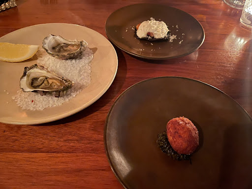 An inventive curious menu and quirky surrounds we enjoyed a selection of bites for starters that included oysters, parsnip fritters and nigella cracker creations. Small but tasty. We paired these with a glass of Endflow Quincy J.