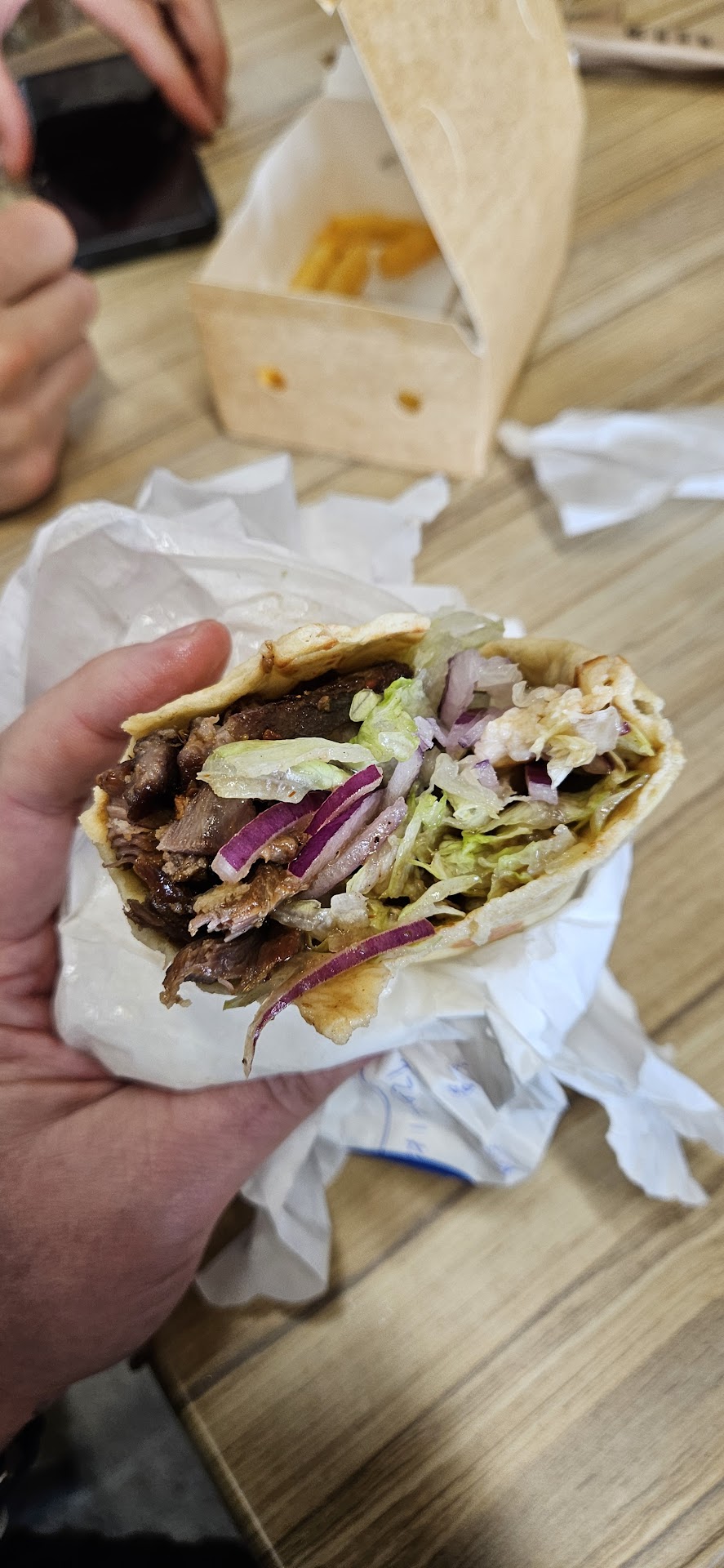 Read moreFirst off ...fantastic souvlaki. This is authentic Greek - a family affair..Mum, Dad and daughters. The maestro of the operation is Dad on the grill...who looks like he has just got off the beach in Mykonos. Food wise he is like the Pavarotti of souvlaki - you could see the care and attention he takes cooking the meat over the charcoal and carefully constructing the kebabs. Unfortunately, imagine Pavarotti actually manning a grill....and speed or lack off is the issue. The output of the grill genius Dad is a bit glacial. Product supperb....product delivery time ....not so good. First time I came here...3 customers in store...20mins for 2 kebabs. Tonight they were busy...people in store and phone orders. 2 kebabs ...30mins. I think a lot of locals trying out the new food offering. But I am waying up whether I go again....the wait ...the wait. Dad needs help on the grill...but many geniuses can't let others help....as they want total control over there work. Come for the food....just be...