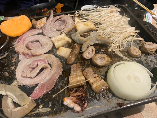 The japchae and fried rice was terrible. The noodle was so hard and dry. I informed the guy and girl chatting at the till counter asking where I could throw it out. I told them it was dry and really bad and they didn't say anything or go check. I then tried fried rice and it too was dry and hard. There wasn't much and I concluded it was left overs from lunch time because it definitely was not fresh for dinner time patrons, considering there were only 8 people in whole place including us. I only enjoyed the tteokbokki and didn't dare try the fried chicken. I was surprised that they had no lettuce to wrap meat in but salad lettuce. I just ate the meat which was a good selection. Anytime our paper was burning someone would come swap out.