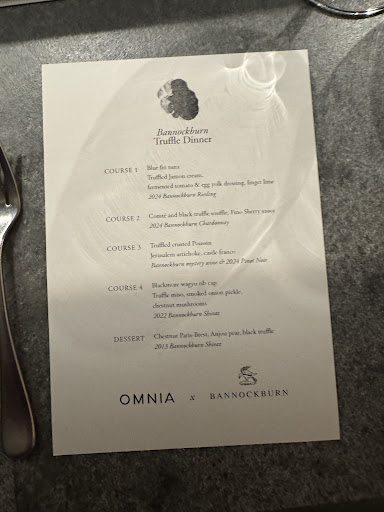 6:30pm. RESTAURANT - Omnia Bistro & Bar Kitchen Counter • Truffles & Bannockburn Wines Dinner Wednesday 13th August 2025. Before my comments. I have to say thank you to the magnificent chefs & staff. Chef was tremendously engaging loved a chat about food. Thank you Steven. The staff from the waiters to the sommelier were all amazing genuine in service polite and professional. I congratulate the management they have a wonderful team.