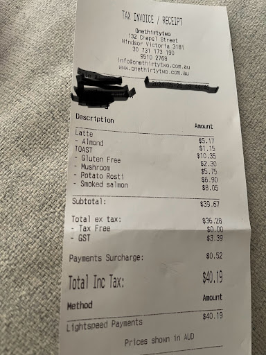 Read moreSecond time visiting this place (my first time was just takeaway which was ok) and I'm very disappointed this time by 1.the customer service and 2. the bill. I was misled when reading the menu. The disappointment came when it was time to order some food. I was sat down with the question "Do you want to start with a drink?" My usual- Almond latte. When the drink came, I was not asked if I'm ready to order food. I wished I had left it like this now. I had to turn to the counter, and waited for someone to be willing to ask me if I needed something. Otherwise, they were all having chats among themselves. I finally ordered some food. My order was 2 slide of bread (which I asked to be gluten free, being non of the wiser), Smoked Salmon, Mushroom and Potato Rossi. The Bill came to $40. If I knew I would have just have normal toast. Little did I know that dry gluten free bread without butter & Jam, which is what you will consider as toast was going to cost me $12.30. For 2 dry slice of bread. I had toast before and today I was not served Toast. I was so shocked when I got the bill. I try to dispute it and mentioned I did not have toast, but it was brushed off by it is the surcharge for weekend. The lack of Customer Service and expensive bread is definitely going to make me reconsider visiting this place again.