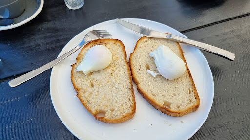 Positives were: Food was amazing! Eggs perfectly cooked and the bacon was thick slices grilled nicely. The banana bread really packed a punch flavour wise, beautifully balanced with soft fluffy banana bread that had a crispy crust. Delicious Happy attentive staff! Pet Friendly (this is always an added bonus for me as we love to take our dog) and the staff were very friendly to our dog. Outside dining that was covered, with heaters that didn't obstruct the amazing view. It was also nicely furnished and felt like a continuation of the cafe itself. Fresh vibe! The music was nice but not obnoxious. Living plants were everywhere which really gave the place a great atmosphere! Very much an attention to detail kinda place. Quick service!! Large (free) parking area. However it does fill up quickly as there is also the local pool and yacht club next door.