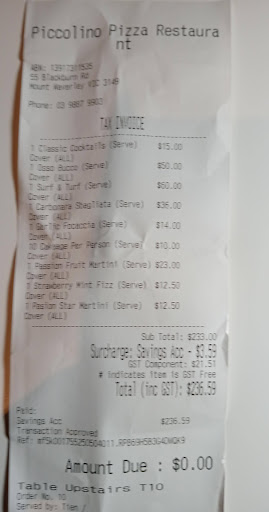 Piccolino markets itself as an upper class Italian restaurant in the suburbs. This is not the experience I had dining at this establishment. The staff obviously wanted to get out ASAP and didn't give a stuff about their job or the customers.