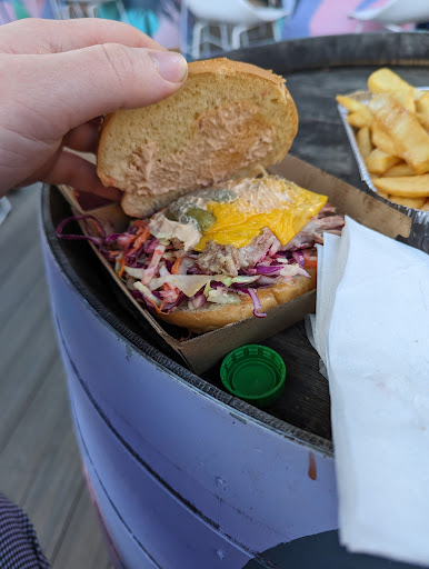 Feel really really over priced, I've got no clue what target market they're trying to hit but when you're ordering at the window, with staff that seem confused when you go off their script and you receive cold pulled pork in a stale bun... They're not hitting it. I ordered the pulled pork burger ($18), chips ($7) and a sprite ($4.5). The burger came out cold, despite watching sit under the salamander (which I don't know why they bother because the cheese wasn't even melted), which to me means pulled pork from the fridge. The portion of pork was pretty middling as well, I understand that meat is expensive but at least spread it out better and maybe loosen it up with some of the juices? The slaw in the burger was pretty tasteless, barely dressed but at least it was fresh, unlike the buns, which were stale and dry. It surprised me when I saw them carrying over a new bag, which was heavily covered in condensation, suggesting a trip through the freezer or that they were packed away hot, as properly frozen buns shouldn't taste stale. I'm not sure if it was old oil, letting the chips sit around too long or a bad batch but they were over salted and rubbery. For coming in on a Friday night around 7pm, I'd be expecting to still see the smoker running, with fresh pork and briskets coming out for whatever dinner rush there might be...
