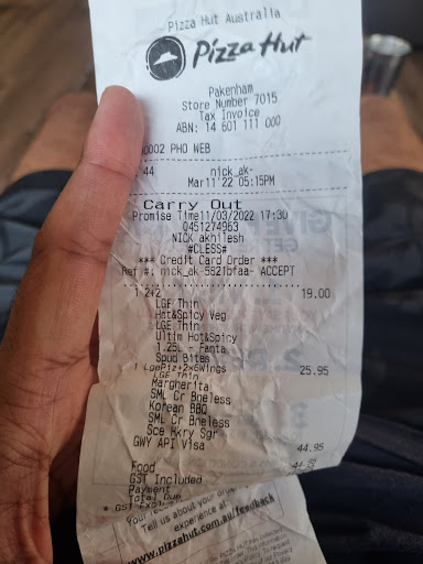 My son Nik ordered from Pizza Hut Pakenham on 11th Mar 2022. He placed the takeaway order on the phone via the main Pizza Hut number 13 11 66. The lady on the phone said that the order was placed successfully and so was the payment. She told my son that she had communicated and passed on the order to the store. When I went there to pick up the order, the franchise owner Amrit was adamant that there was no order under the name Nik. Not only did I provide the name that the order was under, but I also gave the order number "5721bfaa" provided by Pizza Hut on the phone. Amrit went on to state that they do not follow protocols via order numbers. I was left without food and $50 taken out of my son's bank account. I came back home and my son rang up Pizza Hut again, they mentioned that they had already passed on the order to the Pakenham store but would request to call my son back in 2 minutes which they did. Amrit called my son and said yes indeed there is an order here under your name. I then drove back all the way to pick up the cold food and received horrible customer service again from Amrit. He yelled at me again and said we do not follow order numbers. After receiving the cold food and receipt, I checked the receipt, and it had the order number on it the entire time. Very very disappointed, we will never come back here again and I suggest to others not to give them any business for their lack of...