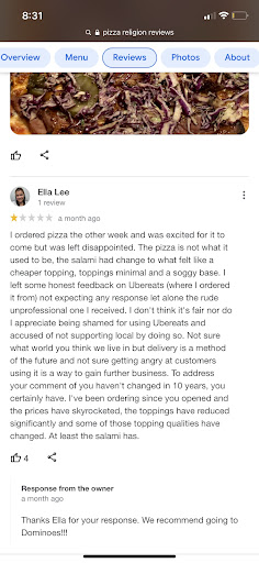 It is a shame as the staff from years back were more friendly and at least looked like they enjoyed being a part of Pizza Religion. As much as I have tried to support them, I will now be going elsewhere for pizza, to places that are at least appreciative of...
