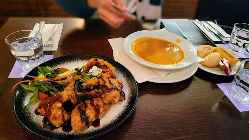 First time coming to this place, since we booked at the hotel for an overnight stay, thats on another review. The cafe was quiet and not overcrowded, which is something I preferred, giving 4 star for the following reasons, when we were seated we were not offered a high chair for my kid, had to ask for it, this should be one of first things to ask when seating a family, waiter may be new, another is one of our order had an issue, this was resolved although waited for a bit instead of being resolved right away. When it came to food, I tried the buffalo wings, it was good, but in any way did not taste like the name, it was breaded fried chicken with not a drizzle but a smudge of bbq sauce of some sort, wife really liked the marinara, did not taste this not a fan, but I am happy my wife liked and enjoyed her food, last is the steak, wine based gravy did not have any taste whatsoever not sure what it was really, however, medium rare steak was cooked perfectly, as the steak I usually get served are not cooked to medium rare, which really is a disappointment, so well done to the chef, also giving my sincerest thanks to the manager and staff who looked after us...
