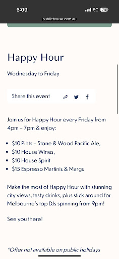 Absolutely incredible! If you're in Melbourne and looking for the perfect place to create unforgettable memories, look no further than Public House. From the moment you walk through the doors, you're greeted with an ambiance that is both vibrant and inviting. The decor is chic and stylish, setting the perfect mood for an evening of fun and excitement.