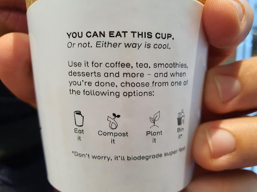 Read moreThere are many drink options available here. We ordered a matcha latte in an edible cup and an oat iced latte. The iced drinks are also served in biodegradable cups, albeit not edible. The edible cup is very very durable and tastes nice. It isn't a cookie, but has a very wholemeal texture and flavour to it - similar to if Special K and cornflakes were used to create the cup. Overall, it is definitely a unique experience and something worth trying if you are interested in environmentally friendly products. The service was also very lovely so we would highly recommend trying the coffee here. There isn't any space to sit and enjoy your coffee here, which is something to note if you are wanting to sit down and enjoy your coffee. They also sell some really lovely looking pastries and donuts which we...
