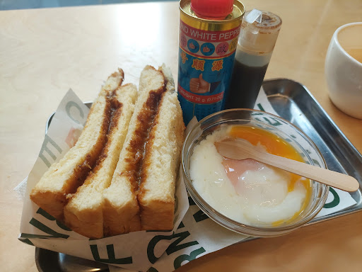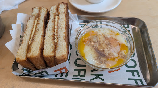 ย ย ย Read moreWe came on consecutive days and if I have one suggestion, it is this: if you plan on getting baked goods, then either wait until at least a half hour after they have opened OR ask the staff if what they are serving you is freshly made from that morning or if it is from the day before. On the first day, I ordered the kaya toast with soft boiled eggs; besides being a little light on the butter slices, I thought the execution was essentially perfect with the thicker-than-expected toasted bread having excellent crispy texture throughout. The next morning, we came right as they opened and I saw that some of the cookies and a few slices of cakes were already in the display, looking very similar to the day before. I ordered a slice of the pandan chiffon cake, which was taken from a glass case where 2/3 of a whole cake was sitting, presumably since before that morning; my wife and I both agreed that the cake tasted a little stale. We then watched as staff placed presumably fresher cookies and other items directly from oven trays into the display case without clearing out the pre-existing baked goods. We have seen many bakeries offer discounts either at the end of the day or the following day to clear inventory for fresh product; we were disappointed that we were charged the same amount for product that wasn't particularly fresh, and I would recommend that you ask about the date/time of baking/preparation before committing to purchasing any of these...