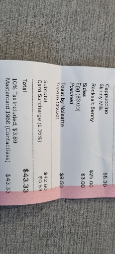 The food is great, the staff servicing the food are friendly, courteous and efficient, but the staff in the counter when it comes to paying our bill, is something else. We ordered Rocksalt Benny and extra egg and Turkish bread under extra section, (see photo supplied). When it comes to paying, the extra egg for $3 was charged correctly, but the extra Turkish bread, instead of $1 as indicated in the menu, he decided to charge us $9.50 for "Toast by Noisette". After getting out if the restaurant when looked at the bill, and it wasn't correct, my husband went back, and front up the cashier, got a refund of $3, instead of $8.50. Again after out of restaurant and discovered the mistake, for the 2nd time, into the cafe, we requested the appropriate refund instead of short changing us. At first he refused, asked me why should he, then I said, it's in the menu, he asked, where, then I pointed out to him, then he started complaining that some people order 1 main dish and ordered many different extras, meaning so that they pay less, I kept quiet. (deep down I felt insulted as we do this many times at other places, there has never been any issues). The cashier is still not happy, and took all the money he gave us and returned us $8 instead of $8.50. By this time I was so angry, I raised my voice, THE MENU SAID $1 NOT $1.50. Only then he reluctantly gave us the change we should be getting. It seems between us ordering the food and paying, the cashier decided to change $1 that we understood as in the menu, and $9.50 for something we have never ordered) He doesn't know the menu, or he disagree with what the menu said. 3 He doesn't like people ordering more than 1 extras with each main (but this restriction was not indicated in the menu) It is such a pity our wonderful outing that started great, in supposedly great looking place, and nice food, is totally spoiled by a narrow minded cashier (may be the owner, or manager) who do not listen to the customer, and even want to take advantage of customer for even $0.50. Thinking that us customer would be too stupid to pick up his...