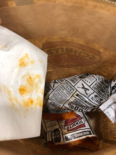I have enjoyed Schnitz in the past, but this experience was deeply disappointing and has made me question the quality and safety standards at your store. I hope this matter will be taken seriously, as no one should walk away from a meal...