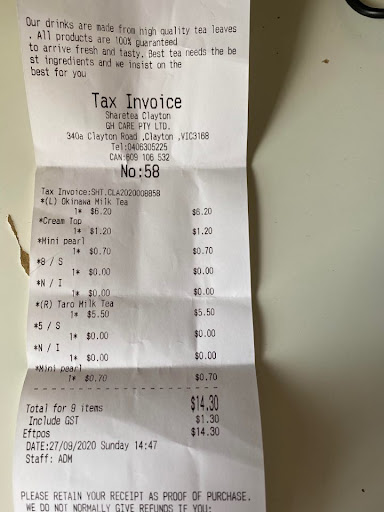 I have been to other shares tea in box hill and i had a good experience but at clayton store - it was very bad experience. Share Tea Clayton - Dt: 15/11/20 at 9:59 pm - tax...