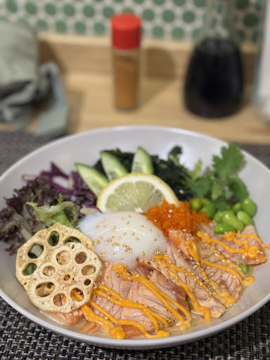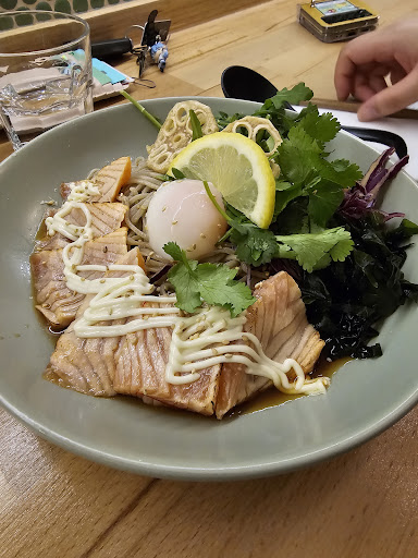 Read more🥢 After reading the book "Soba: So Good" displayed on the bookshelf, I felt positive about the restaurant. Unfortunately, the soba did not live up to the book's description of being "sweet and fresh." Instead, it tasted very dry and artificial. Additionally, the salad and sesame dressings overshadowed the flavors of the egg and salmon. I’d describe it as a modern, Westernized poke bowl-style soba rather than the authentic soba I was hoping for. Furthermore, the deep-fried lotus root tasted like cardboard…