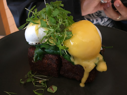 For brunch we chose the Charcoal Charger which was a porridge dish made with activated charcoal organic oats, turmeric poached pear, oreo crumb and caramelised marshmallow. There was strawberry soy milk for pouring. The pears were perfectly poached and added a nice contrast the this deep delicious and wintery dish.