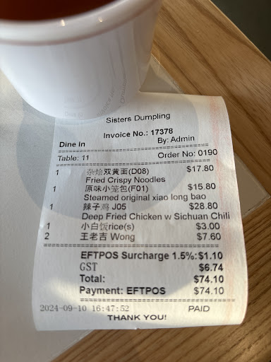 $74.10 for two people dinner. As I said will very unlikely be coming again, but literally being the only Chinese restaurant that is the most local, maybe takeaway but definitely not...