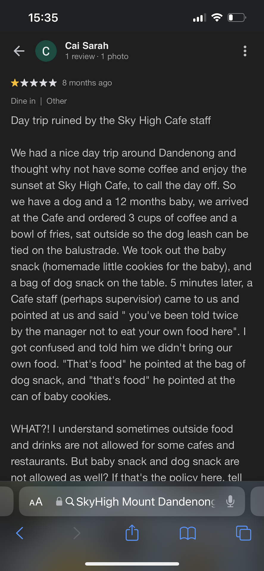 We had a nice day trip around Dandenong and thought why not have some coffee and enjoy the sunset at Sky High Cafe, to call the day off. So we have a dog and a 12 months baby, we arrived at the Cafe and ordered 3 cups of coffee and a bowl of fries, sat outside so the dog leash can be tied on the balustrade. We took out the baby snack (homemade little cookies for the baby), and a bag of dog snack on the table. 5 minutes later, a Cafe staff (perhaps supervisior) came to us and pointed at us and said " you've been told twice by the manager not to eat your own food here". I got confused and told him we didn't bring our own food. "That's food" he pointed at the bag of dog snack, and "that's food" he pointed at the can of baby cookies.