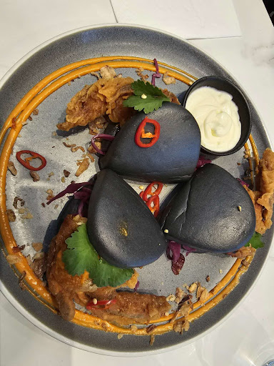 Soft Shell Crab Chilli Sider - fried in garlic salt, pickled purple slaw with spicy mayo, cucumber and coriander in a charcoal bun. How stunning is this dish? And it tastes just as good too! That perfect combo of crunchy crab, fresh slaw and a soft warm bun. Highly recommended, if you order just one dish make it this one.