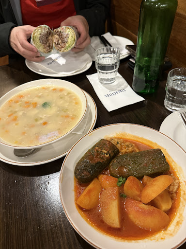 I finally tried Stalactites with my fiancé after walking past it so many times. The food really lived up to expectations: the homemade fish soup (psaradouoa) was hearty and comforting, and the baked zucchini with rice and potato was full of flavour without being heavy. My fiancé had the mixed giros souvlaki wrap, which was well-seasoned, tasty, and balanced.