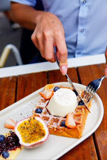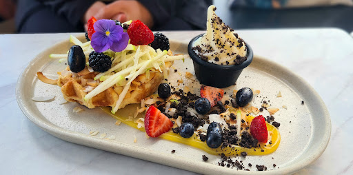 We had the coconut waffle with sake poached fruit and the pulled pork benedict with apple slaw. Also, some hash browns. So the buts... The apple slaw was just apple matchsticks, finesse in the prep but didn't add anything to the dish, a proper slaw would have been better. Also, I am admittedly very against the use of flowers, they add nothing and are unnecessary. Leave them in the garden not on the plate! However, the toast was buttery as, pork was tender and saucey, waffles and fruit were also fresh and punchy. Hollandaise was not cold and tasted fresh! You know when you get a benny dish and the hollandaise is ice cold over your eggs... UGH, well not in this case!