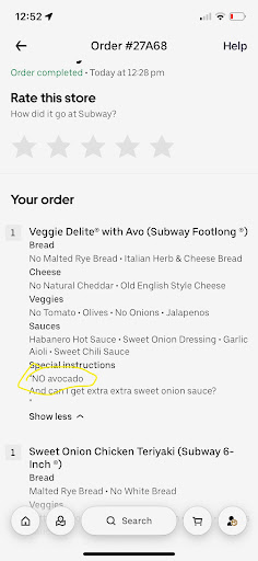 My husband and I ordered two separate subs. The staff member began making my sub first and added my vegetables. When it came to sauces, I told her my three choices. She started with the first sauce, but the bottle ran out. She replaced it but, instead of asking me about the remaining two sauces, she started asking my husband about his sauces and then added one of his sauces to my sub. I said “it’s okay,” but then she asked my husband again about his sauces and almost put the same one in my sub a second time.