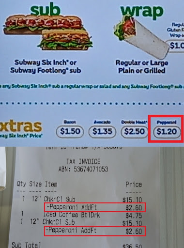 Read moreYeah it's Subway. I don't get it. It's mass produced, highly commercialised "rolls with fancy arse fillings, a variety to satisfy just about all individual tastes, quirks and all. A rare tick in the Subway experience. Do yourself a favour and go to the bakery... buy a roll such as a pane de case roll or perhaps a Kaiser roll dusted with a bakers flour, or maybe Then fo to a deli, buy whatever your heart desires. Me, I purchase Serrano ham, very thinly sliced, tomato, avocado, cucumber, baby spinach leaves, lightly spiced tomato relish. I place the fillings inside my roll. I close it up and take my first bite. It's perfection. Yum. See...