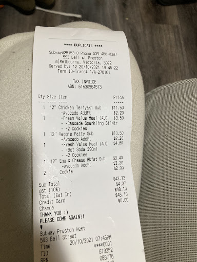 usually subway isnât my first choice when it comes to fast food.. but i decided to give it a crack since i havenât had it in about 25 years! i got to subway and made a decision of what to order.. a chicken teriyaki 12inch sub with lettuce, tomato, olives, jalapeños, carrot, buffalo sauce, pepper but no salt because i find that the olives make it salty enough! and of course i got it toasted so the old english cheese i chose to garnish it with melted perfectly. i walked up to the west side of the counter and was ready to order. âhi can i please get a 12 inch on white breadâ i said. the worker looked at me, he was probably in his mid 20s. he responded to me by saying that â6 inches was enoughâ. i looked at him in a confused way. âdo you guys not do 12 inches anymore?â i said. âno we do, i just think that 6 inches is plenty and youâll definitely be fullâ he replied. i was confused.. how could this man possibly think he knows what my appetite is? i was HUNGRY. very hungry. in fact i could order 2, 12 inches, eat the lot, and then go to mcdonaldâs and order a 10 piece nugget meal and polish that off too. âfine can i get 2, 6 inches then?â i say. he responded by say no. i dove over the counter, and started taking matters into my own hands. i made the whole subway my self, managing to only burn the bread once, which is good considering i didnât know how to use the toaster machinery. anyway i did pay, because iâm a good man. but by the time i was leaving with my delectable subway (made by yours truly), the cops where outside and put me in the back of the divvy. i told them to try my sub and they did.. they told me my subway was so good that they would let me go free of charge. i went back to the same subway the next day and asked for the boy who refused to make me my sub yesterday. they told me he got a transfer to a new subway. so if youâre reading this Michael ( the subway worker) iâm going to try every subway until i find you. and you best believe youâre going to make me my 12 inch sub. kind regards...