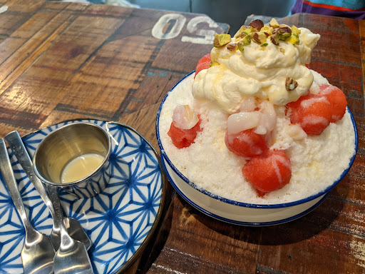 The matcha lattes were lukewarm at best and mostly just foam. The mochi in the injeolmi toast was more slimy than chewy. Shaved ice just tasted like frozen milk. The only decent things were the pre-made cakes and the mango pudding but definitely not worth waiting for over an hour especially when all these things are premade.