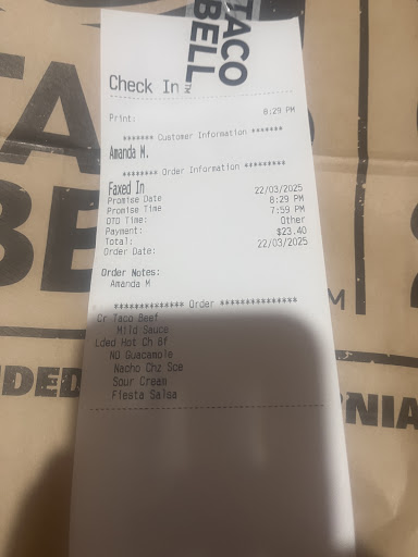 Read moreTo the owner: FIRE THIS MANAGER! FIRE THE STAFF! Update: NEVER go here! The current owners and staff are TERRIBLE! Cold food is stale and warm, hot food is cold, wait tines in excess of an hour in store! Hair in the food frequently! Staff are rude! 0/10 will NEVER go to a taco bell again!