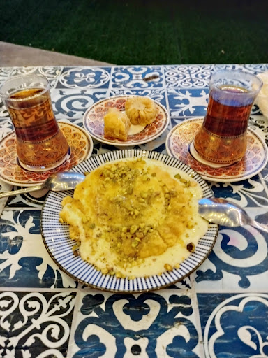 A shared platter of pastries (for 2 people, $48.00). This consisted of a small piece each of each type (cheese, spicy meat) a couple of pieces of cucumber, a couple of tomato, a small dish of olives, an equally small dish of hummus, and a tea. Neither pastry was that âspecialâ. And the portion size would have comfortably fed 1 person. We were so surprised at the size of it, we even asked if it was supposed to be for 2. To which âyesâ was the answer.