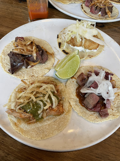 🌮 Pescado Taco: baja style crispy fish, mexican tartare, pickled cabbage 🌮 Birria de chivo: goat birria, queso requeson, fresh jalapeno 🌮 Salchichon de la casa: grilled house made mortadella, mustard pickles, avo crema 🌮 Maiz blanco: white corn, salsa macha, mint crema, pickled onions Flight of 4 tacos ($28.00)/ ($8.50) each