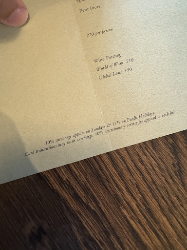 The upsell on the wine was blatant. Junior somm recommended three different chardonnays priced per glass at $62, $59 and $58 accordingly. Relatively very pricey pairings on a $175 menu. I dined at Attica the week prior and Minamishima the night prior and the wines and cocktails were priced much sharper than ten minutes. I did not get a chance to benchmark wine bottle prices however another review has noted over 3x. Our very average old fashioneds were $30 each which was more than what we paid for the iconic wattleseed old fashioneds at Attica that are absolutely delicious.