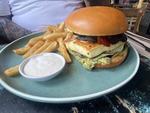 Halloumi burger was tasty but honestly would not order again. Texturally it’s very soft and mushy, due to the ingredients not it being poorly made. It’s avocado, grilled eggplant? A little lettuce on a soft bun. Like it needs more crunch and acidity to be just that little better. It’s got a generous serving of haloumi though and I’m never mad at that. Chips were delicious and crispy. But again, just definitively would not order again.