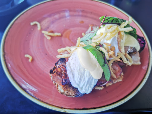 The house benny and the food only filled half of the plate. My toast was burnt, and my friend's toast was chewy. Both of our eggs were cooked to almost firm yolk, rather than the runny yolk you'd expect from eggs benedict. The potato scratchings on top were stale and chewy.
