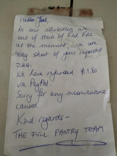 Also, hand written note [attached pic], and everything packaged in primary-school-canteen-lunch/butchers bags, combined with transferring cash back to you, no questions asked? Seriously, the nostalgia, the fact that someone will pick up a pen to write you a note [damn, I haven't had anyone write me note like that since I was in High School] AND give you some cash back because they couldn't fulfil the order?