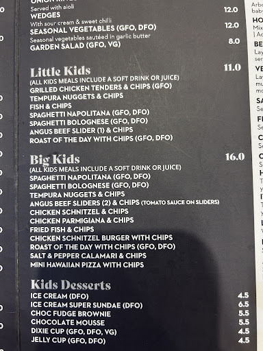 steak - 1/5: this was overcooked and tough (after the debacle with the waitress and manager the recipient was too intimidated to say anything so didn't eat it or return it) chicken kiev- 2/5: this was dry and had no garlic butter inside (which is kind of the point to chicken kiev) sticky chicken- 4/5: this was surprisingly nice given the other meals. Only feedback on this one was that there was a lot of rice and not enough sauce. seniors seafood basket- 1/5: consisted of lots of chips and not much seafood. The seafood was of the heated up frozen variety. Could have done better with products bought from Aldi at home. Pizza- 3/5: Ok but nothing to rave about Aussie Parma- 1/5. Three people ordered this at our table and all agreed it was well below standard and was not nice.