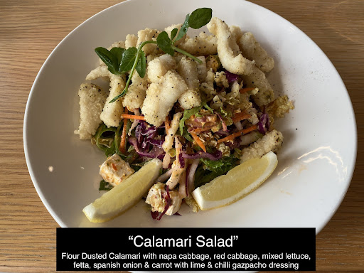 “Calamari Salad” Flour Dusted Calamari with napa cabbage, red cabbage, mixed lettuce, fetta, spanish onion & carrot with lime & chilli gazpacho dressing