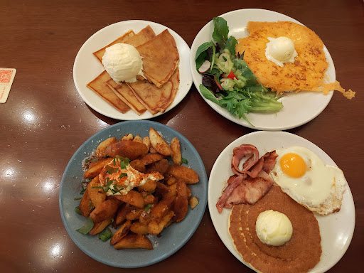 Food 5/5 *Cheese and Potato Pancake - Absolutely delicious! Been eating these pancakes for the last decade more since high school! That cheesy crusted layered on top of the Pancake is the signature unique point. Hint - Always add bacon bits to it upgrades the texture of the Pancake so you get soft, medium and crispy textures melting and exploding in your mouth. If you're feeling generous, add mushrooms too! *Pancake Short Stacks are equally amazing! Milky, creamy not too sweet vanilla ice cream on signature pancakes or soft, yet crispy crepes! Do not miss these 2 amazing dishes! *Fish and Chips was also generous portion, fresh and delicious, but not as great as the above *Deluxe Fries are an unmissable dish as well! Hand peeled and cut wedges, topped with fresh sour cream and delicious seasoning. Phenomenal!