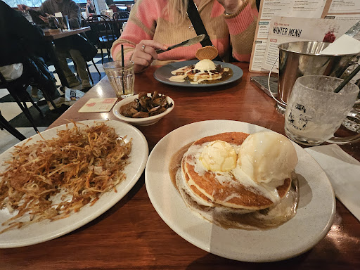 The food itself was a bit average. I ordered a stack of pancakes and asked for extra ice cream ($7 and only one scoop was given, I was told it would be extra which is fine but expected two scoops), I ordered a "hashbrown" and was given a plate of shredded fried potato (hash) I did query with staff if this was considered a hash brown and they said yes. Had it been written as hash I wouldn't have queried it but that's certainly not what people would class as a hashbrown. I also ordered the mushrooms which arrived almost cold though they did taste nice still. A staff member did check in at one point to ask how things were, I said "good but.." and she walked off. I didn't bother complaining as I didn't want them to think I was trying to get more free food. The milkshake was amazing (as you would hope for $10 for a small glass) and Mt friend said her orange juice and sticky date pancakes were good.