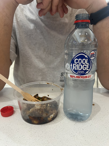 My partner spent $16.65 for a bottle of water and âSmallâ container of Black bean beef with fried rice & honey chicken.
