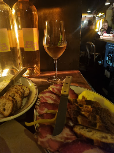 Not sure if there was meant to be table service or they were just busy but I ended up grabbing my own menu and ordering a Rosรฉ and cheesey/meaty board at the bar (not before interupting a lovely lass from the Neighbourhood Pizza joint thinking she worked there. But god love her- she did try to get me a menu anyhoo heh heh). Post order, the wine and food came out quickly and it was all rather yummy.