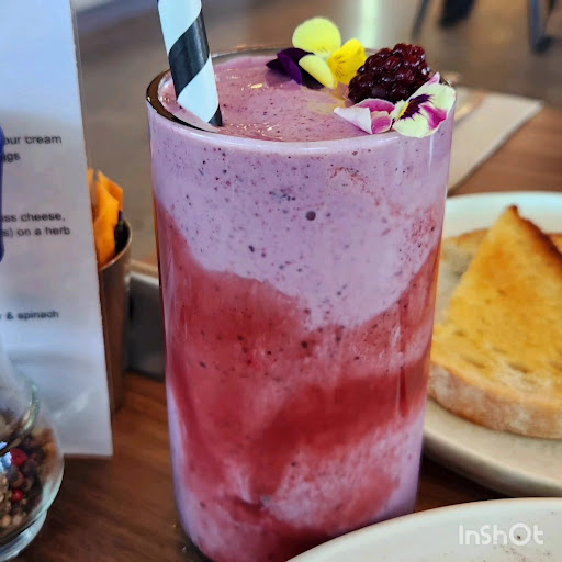 I shared a Croquette benedict w bacon, A mixed berry smoothie Halloumi eggs and a Cappuccino.