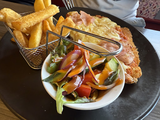 The chicken schnitzel bolognaise, the chicken schnitzel itself was good, but it was topped with browned minced meat which had no added flavourings and absolutely no resemblance to a bolognaise sauce. The melted cheese on top was there to hide this pitiful attempt of ābolognaise sauceā topping on the schnitzel. The one and only wedge of tomato provided in the sub standard salad did not have any red or orange colour and the seeds were falling out indicating both poor quality and not being fresh. The salad overall was under par it consisted merely of a mix of salad leaves (mesclun) and two crescents of cucumber with the seeds had been removed, this detracted from any quality that the meal could have had which was a shame. The beer battered chips were presented in the trendy wire basket and were cooked well. My meal was the beef wellington on the main menu, I found it to be good on this night with the eye fillet well rested in the middle and still pink with a good covering of duxelle (braised mushrooms, onions and herbs) but this needed more herbs (rosemary, thyme, sage) and more seasoning to give more of a lift to the dish. The single piece puff pastry covered all the single piece of eye fillet making it a readymade for service item and when ordered by the customer just matter of placing it into the oven to reheat. This meal item is a good idea from the kitchen team as this speeds up service as the potato rosti is ready for service just requiring the fresh broccoli and sauce to serve the meal. The rostii was still soft in the middle, again needing some more seasoning. The sauce was good, suggesting not just the highly salted thick packet mix gravy, but a base stock and thickened up ready for service. Calling it on the menu a ājusā is not correct as this is āpan juicesā and would be a completely different sauce, so it would more like a beef sauce, rich beef sauce, red wine beef sauce, or similar. The broccolini was cooked and crisp, thank you, and...
