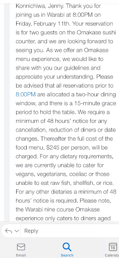 After all the commotion, we arrived 1 minute post the '15 min grace period' i.e. 8:16pm for our 8pm seating and was told that the first course was no longer available and that we would only be served from the second course onwards. Reason being they had thrown away the ingredients for the first course as they were no longer fresh (who knew scallops and abalone could only stay fresh for 15 min!) - talk about food wastage! Important to note that it was not stated anywhere in the T&C that a reduced course will be served if you arrive past the grace period - refer to photo attached.