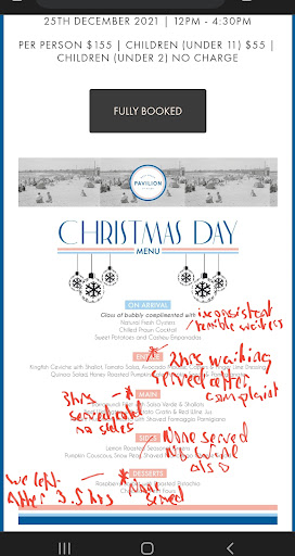 Read moreMyself my gf and her mother booked Christmas lunch here. We did this to have a stress free day and enjoy the fine food of Melbourne. Well this was one of the biggest let downs I have ever experienced in my life. From the poor lack of effort when welcomed at the door. Not even shown to our seats but pointed across the room. Then to the waiters which I can only imagine were temp and very cheap and inexpensive. Welcome nibbles from a full plate of pastries, to oysters with no lemon and baby prawns on a stick advertised as prawn cocktail. We were lucky to be even offered all 3 , new arrivals beside us we're not even offered any. 2 hrs waiting on starters which we only received due to complaining to management. Drink service which was rude and inconsistent RSA ?? . From walking around venue we realised it had gone all wrong but attempted to make a very poor effort at hiding it nor expressing his apologies to patrons. At one point a party of 10 and 2 kids just walked out after 2 hrs no food served at all . We received mains after 3hrs, cold and no sides nor wine served as promised. At this point we decided to leave also 3.5hrs later not willing to wait for dessert at this point. We left smiling and in good spirits as we enjoyed the company of other patrons in our surroundings. Unfortunately the laughing was at the expense of what we called The Fawlty Towers off st kilda. Its sad to see such an event fall to shambles, whether it was poorly organised, poorly staffed or whatever. Simple customer service and acknowledgement of the mistakes as they happened would of been a start. Wish this venue a speedy recovery and I hope it does right by the people of Melbourne who paid out for what I can only call a Fiasco on...