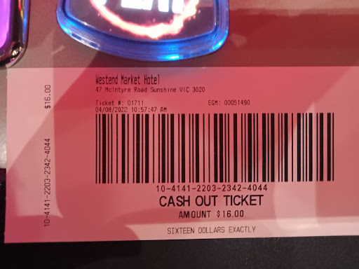 Read moreToday I went to 5 different pokie venues, they are Palms, Westend Market, Ashley Hotel, The club and Deer Park Club. Among those 5 venues, Westend Market is one of the top 3 pokie venues I highly recommend. Reason 1: Easy parking. Reason 2: Clean and neat indoor environment. Reason 3: Staff member Christine is friendly and accommodating. Reason 4: Coffee is available for free. Love that. Reason 5: There are popular dragon link, lightning link and storm link slot machines for us to choose from. The progressive grand jackpot on storm link has been over $50000, which is crazy. I will go there again to play the pokies for fun. Today I cashed in $5, played the dragon link, 1 cent denom, 50 lines, 50 cents a spin, cashed out...
